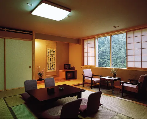 Nestled among beautiful nature in a highland where wild birds and squirrels are seen up close, we urge you to come and spend leisurely relaxing time while bathing our outdoor bath overlooking Japanese garden and Chomeisen large bath of natural hot spring.