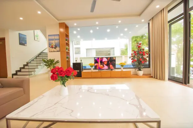 - Có 1 phòng khách rộng, được trang bị truyền hình internet TV, Điều hòa, Quạt cây, Wifi, Bàn ghế tiếp khách uống trà, Karaoke, WC