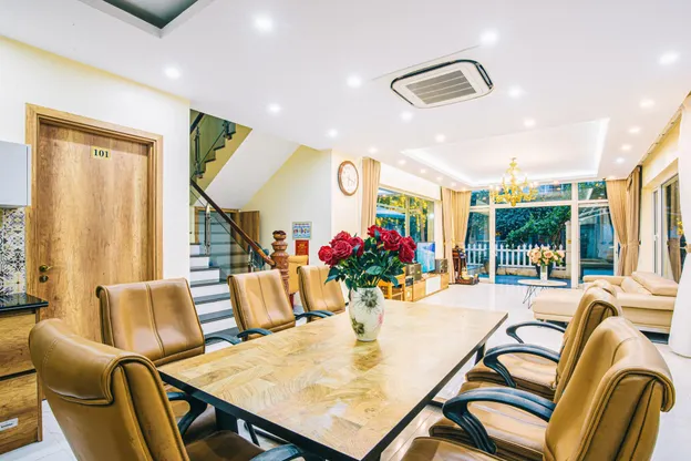 - 7 phòng ngủ khép kín với tổng cộng 8 giường (2 giường 1m6 và 6 giường 1m8. Mỗi phòng đều có Tivi, wifi, máy sấy tóc, Bình nóng lạnh, điều hòa, WC, bàn ghế ngồi uống trà
