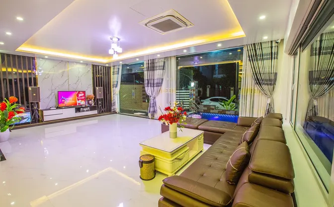- 1 phòng khách rộng: Tivi 55in, truyền hình internet TV, Điều hòa, Quạt cây, Wifi, Bàn ghế tiếp khách uống trà, Karaoke, WC)