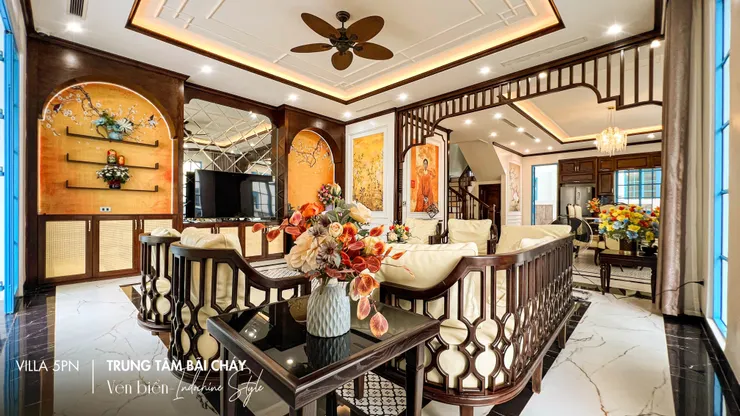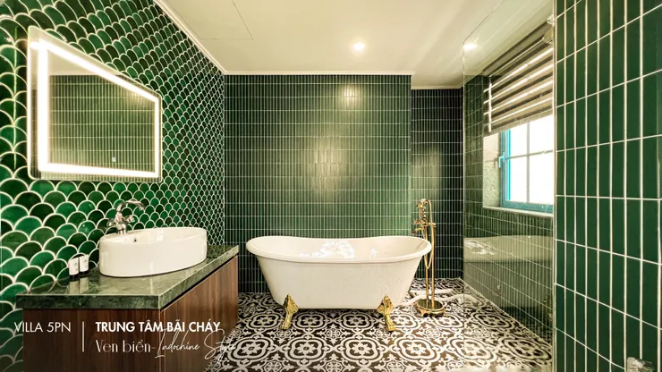 - Diện tích 250m2, sân vườn xanh mát tạo cảm giác thư thái, không khí biển trong lành. Villa được thiết kế theo phong cách Indochine hài hòa mang cảm giác sang trọng, ấm cúng.