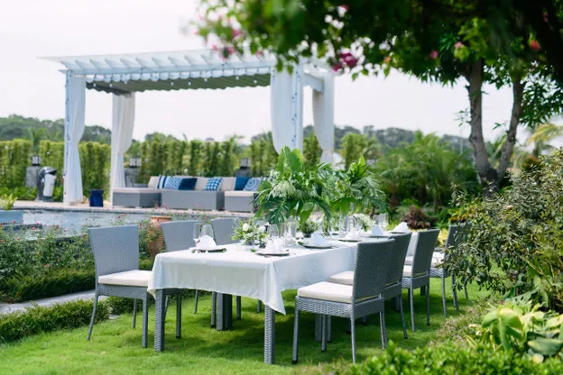 - Sân vườn được thiết kế phong cách nhiệt đới hoà mình vào thiên nhiên, cực chuẩn cho team sống ảo, selfie.
