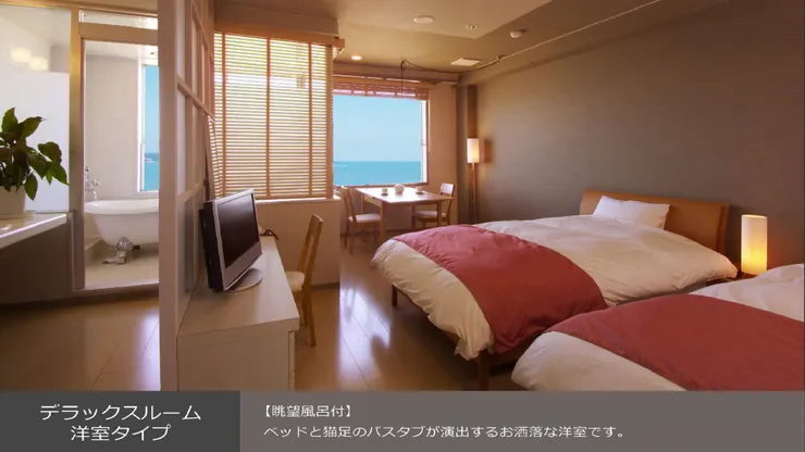 Located 10 minutes on foot from Kamogawa station, this hot spring hotel overlooks the view of ocean blue color Maebara bathing beach selected as one of the best 100 scenic beaches of Japan.
