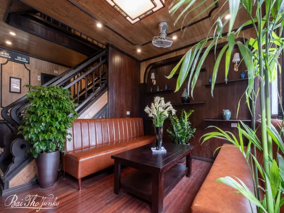 12:15 Xuồng máy cao tốc đưa đoàn lên tàu làm thủ tục check in, thưởng thức nước uống chào mừng, nghe giới thiệu về lịch trình tour và các quy định an toàn trên tàu.