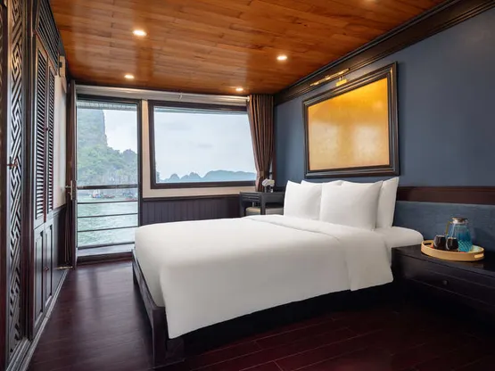 - Phòng ngủ riêng sang trọng trên tàu với điều hòa và phòng tắm riêng.