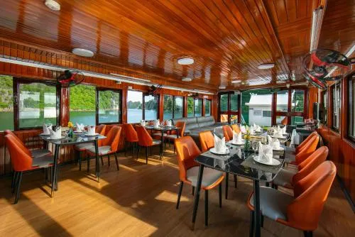 Khách hàng có thể lựa chọn dịch vụ ăn uống bao gồm các món ăn truyền thống Việt Nam và các món đặc sản theo mùa tại nhà hàng của du thuyền. Ngoài ra, quầy bar cung cấp đồ uống như bia, cocktail, rượu vang và nhiều loại đồ uống khác.