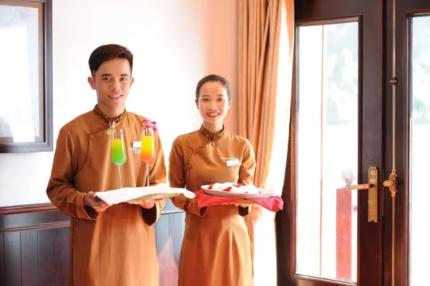 - Trên du thuyền có nhà hàng phục vụ tất cả các bữa ăn, với set menu tự chọn và món đặt biệt. Quán bar trên du thuyền cung cấp nhiều loại nước trái cây tươi, cocktail và rượu vang.