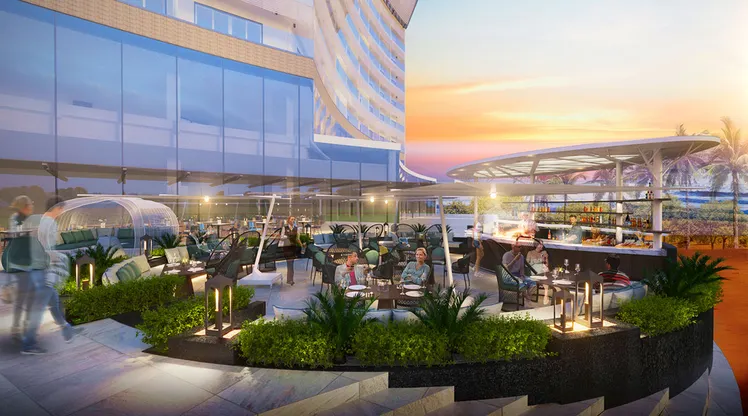 Khách có thể thỏa thích thưởng thức thịt bít-tết nhập khẩu và rượu vang hảo hạng tại nhà hàng Mad Cow Wine & Grill trên tầng thượng, với khung cảnh chân trời bất tận và tầm nhìn ra biển Phú Quốc. Từ khách sạn, du khách cũng có nhiều lựa chọn ăn uống với các món ăn, hải sản địa phương tại Làng Chài Hàm Ninh và Chợ Phú Quốc.