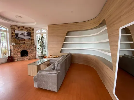 Phòng khách với lò sưởi cổ điển và nội thất đơn giản nhưng tinh tế, tạo điểm tập trung ấm áp cho gia đình hoặc nhóm bạn. Bạn cũng có thể thư giãn bên cây đàn guitar ấm áp hoặc tổ chức bữa tiệc BBQ tại sân vườn.
