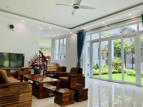 - Phòng khách rộng rãi với bộ sofa thư giãn và hệ thống karaoke hiện đại.