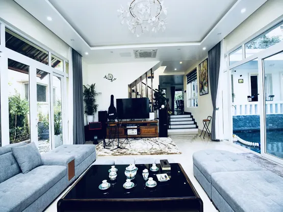 - Phòng khách rộng lớn với bộ sofa thư giãn và hệ thống karaoke âm thanh sống động.