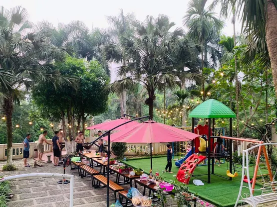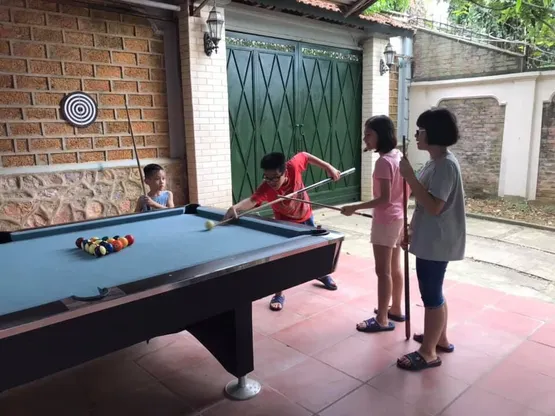 - Khu vườn rộng rãi với nhiều cây xanh và hoa tươi thích hợp cho trẻ em vui chơi. Có cả bàn bi-a phục vụ cho phái mạnh.