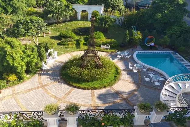 Với phong cách lâu đài Châu Âu, Quentin Mansion Villa là một kiệt tác kiến trúc nằm giữa khu vườn hoa lá. Tòa nhà chính được thiết kế với nét hiện đại và tháp Eiffel thu nhỏ tạo điểm nhấn độc đáo.