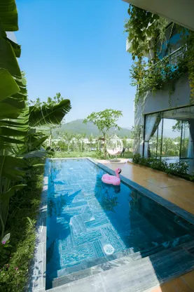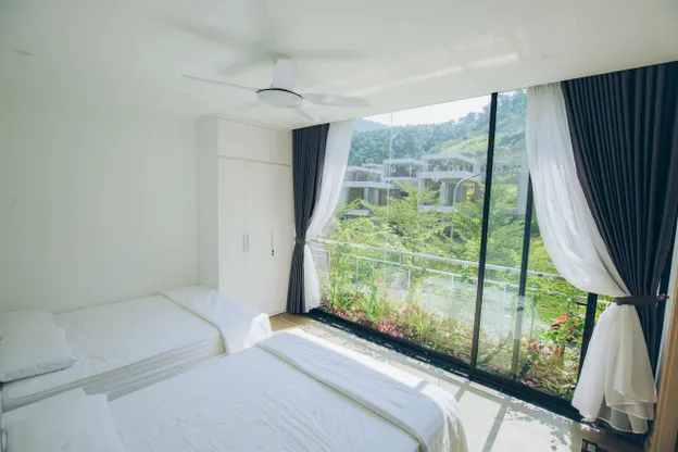 Villa F1.5 có 3 phòng ngủ, 4 giường, 4 phòng tắm với bồn tắm view núi, 1 phòng khách, và 1 bếp. Chúng tôi có sẵn gần 150m2 sân vườn toàn cây xanh và cây cỏ, để bạn thư giãn tận hưởng không gian tự nhiên.