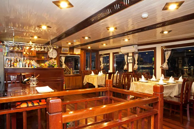 Thực đơn đa dạng từ các món ăn quốc tế đến đặc sản địa phương sẽ được phục vụ tại The Dining Room trên du thuyền, cùng với tầm nhìn tuyệt đẹp ra Vịnh Hạ Long. Khách cũng có thể thưởng thức đồ uống và cocktail tại quán bar Marguerite.