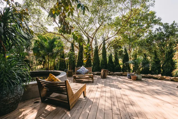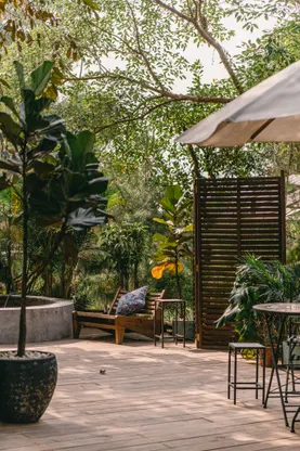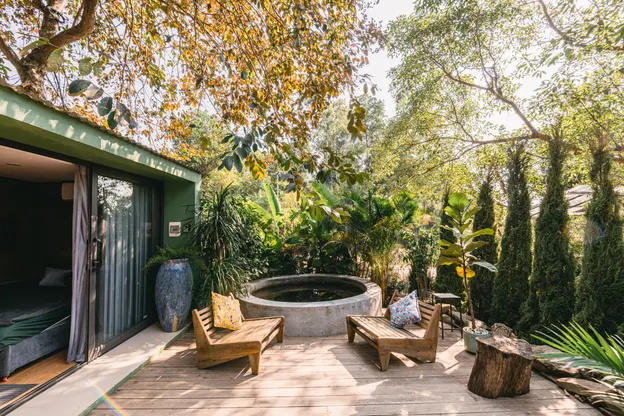 - Bể ngâm thư giãn ngoài trời với hàng rào cây nhiệt đới tạo cảm giác thư thái và hòa mình vào thiên nhiên xanh mát.