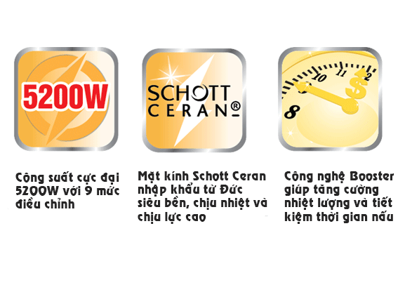 Tổng công suất 5200W nấu chín thức ăn nhanh chóng.