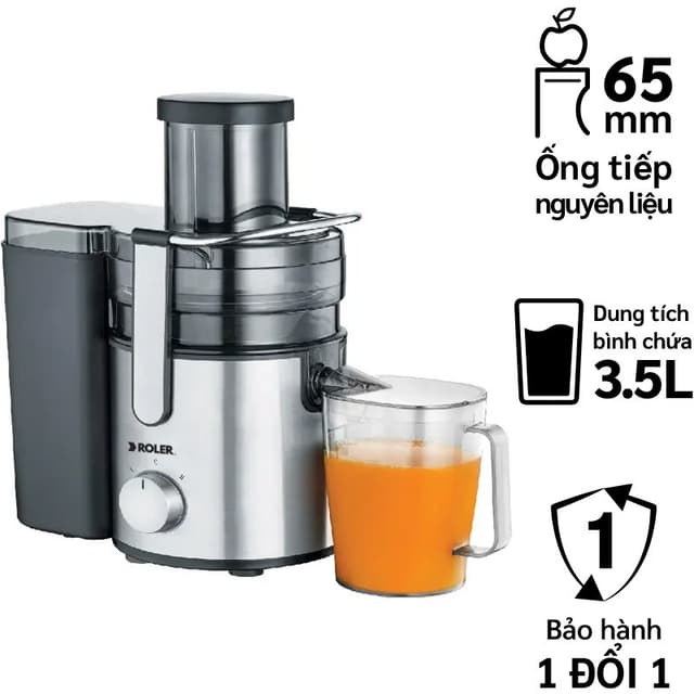 Máy ép trái cây đa năng Roler là lựa chọn vô cùng tuyệt vời cho gia đình, nhất là trong những ngày hè oi bức. Với công suất hoạt động lớn, động cơ vận hành êm ái, máy có thể ép được nhiều loại hoa quả cùng một lúc trong thời gian ngắn. Không những thế, ống tiếp nguyên liệu lớn 65mm ép trái cây nhỏ nguyên trái dễ dàng.