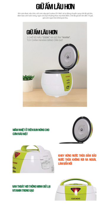 Tổng quan về sản phẩm:CuckooCR-0661- xanhNắp gài1.0 lít500W2 - 4 người (1 - 1.5 lít)Chống dính500gHợp kim nhôm phủ chống dínhGia nhiệt 4 chiềuVan thoát hơi thông minh giữ lại vitamin24 ThángChi tiết sản phẩm