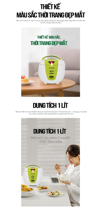 Nồi cơm điện Cuckoo CR-0061 được sản xuất với dung tích 1 lít thích hợp với 1 - 1,2kg gạo, nấu được cho 2 đến 4 người ăn, phù hợp gia đình ít người hoặc sinh viên.