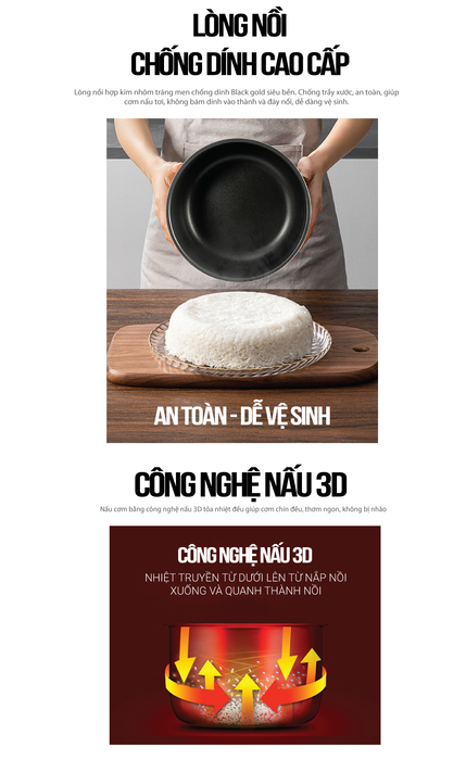 Cơ chế gia nhiệt 3D tại đáy, 2 bên thân và trên nắp vung giúp cơm chín đều và giữ ấm lâu hơn.