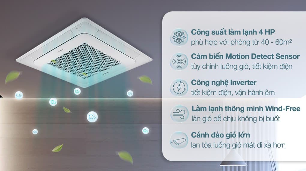- Thuộc dòng máy lạnh âm trần, được thiết kế dạng vuông với bốn góc được bo cong nhẹ tạo được cảm giác nhẹ nhàng. Gam màu trắng trang nhã nên dễ dàng kết hợp với các không gian phòng.