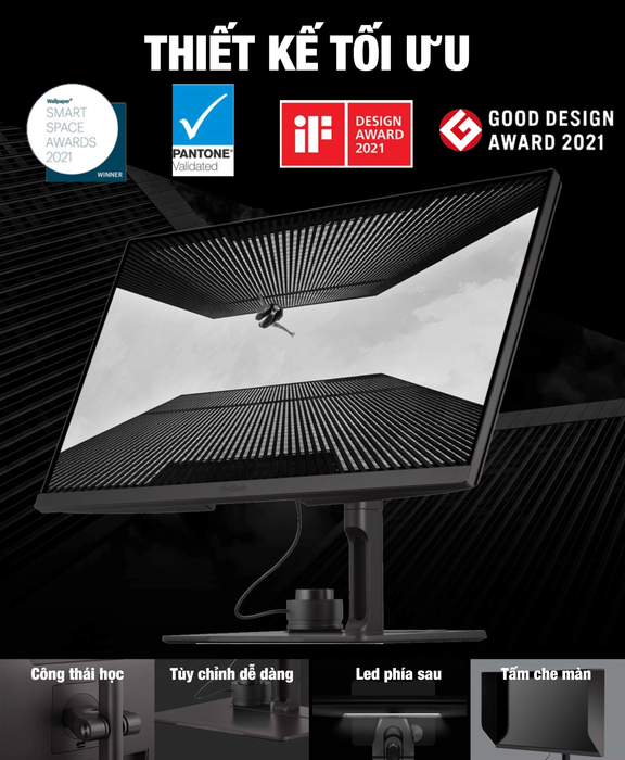 Chân đế màn hình bằng thép, điều chỉnh 5,1″ theo chiều dọc, xoay 120°, nghiêng 21° và xoay 90°. ViewSonic cũng bao gồm Bánh xe ColorPro. Điều này không chỉ có thể điều chỉnh cài đặt hiển thị của màn hình một cách thuận tiện mà còn có thể được sử dụng như một nút xoay điều khiển có thể nhấp rất tiện dụng cho phần mềm tương thích như Adobe Creative Suite và Capture One.
