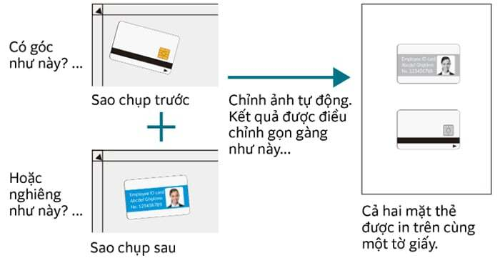 Chế độ sao chụp thẻ ID với tính năng tự động chỉnh giữa nghiêng lệch cho một hoặc nhiều thẻ.