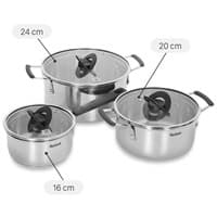Bộ nồi bao gồm 1 quánh 16 cm, 1 nồi 20 cm, 1 nồi 24 cm, phù hợp cho gia đình từ 4 - 6 người.