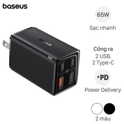 • Adapter sạc Baseus được trang bị 4 cổng sạc, bao gồm 2 cổng Type C và 2 cổng USB, cho phép sạc đồng thời nhiều thiết bị như điện thoại thông minh, máy tính bảng và laptop.