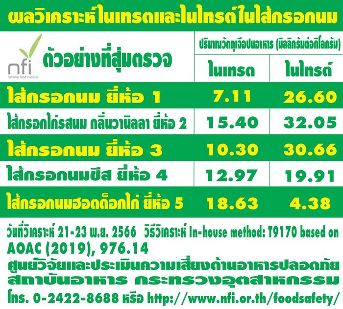 สถาบันอาหารได้ทำการเก็บตัวอย่างไส้กรอกนมจาก 5 ยี่ห้อในเขตกรุงเทพฯ เพื่อวิเคราะห์ปริมาณไนเทรตและไนไทรต์ ผลการทดสอบพบว่าไส้กรอกนมทั้ง 5 ตัวอย่างมีไนเทรตในช่วง 7.11-18.63 มิลลิกรัมต่อกิโลกรัม และไนไทรต์ในช่วง 4.38-32.05 มิลลิกรัมต่อกิโลกรัม โดยปริมาณไนไทรต์ที่พบยังไม่เกินค่ามาตรฐานที่กฎหมายกำหนดให้สามารถใช้ไนไทรต์ในไส้กรอกได้สูงสุดไม่เกิน 80 มิลลิกรัมต่อกิโลกรัม ดังนั้น ผู้บริโภคสามารถทานไส้กรอกนมได้อย่างปลอดภัย เพียงแต่อ่านฉลากก่อนซื้อเพื่อให้แน่ใจว่าเป็นไปตามข้อกำหนดของกฎหมายและทานอาหารให้หลากหลายครบถ้วน 5 หมู่เพื่อสุขภาพที่ดี