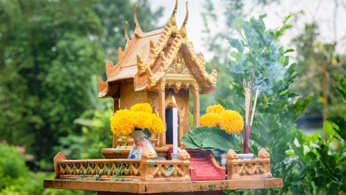 ตุ๊กตาศาลพระภูมิและรูปปั้นต่างๆ นั้นถือเป็นการถวายความเคารพและความเพลิดเพลินแก่สิ่งศักดิ์สิทธิ์ เมื่อตุ๊กตาศาลพระภูมิหักลง บางคนเชื่อว่าเป็นการกระทำของผู้ไม่หวังดีที่ใช้คุณไสยหรือมนตร์ดำ แต่ก็มีบางคนที่เชื่อว่าเป็นสัญญาณของลางร้ายเท่านั้น