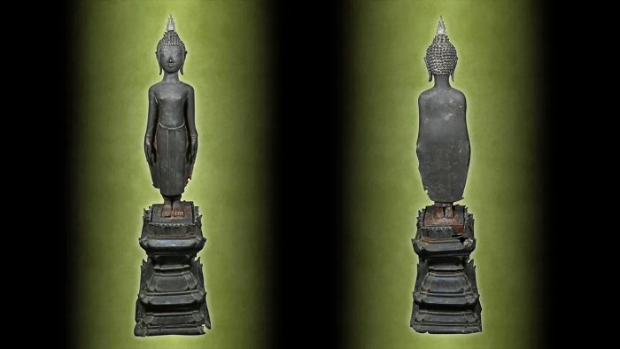 พระพุทธรูปบูชายืน สูง 42 นิ้ว ในสมัยเชียงแสนล้านนา ปางเปิดโลก 3 ถอด ของ สจ.บอมบ์ เมืองน่านพระพุทธรูปยืนปางเปิดโลก สูง 42 นิ้ว พุทธศิลป์สมัยเชียงแสนล้านนา เนื้อสัมฤทธิ์ 3 ถอด (พระเกศ, องค์พระ, ฐาน) ของ สจ.บอมบ์ เมืองน่าน เป็นพระพุทธรูปล้ำค่า อายุถึงยุคพุทธศิลป์