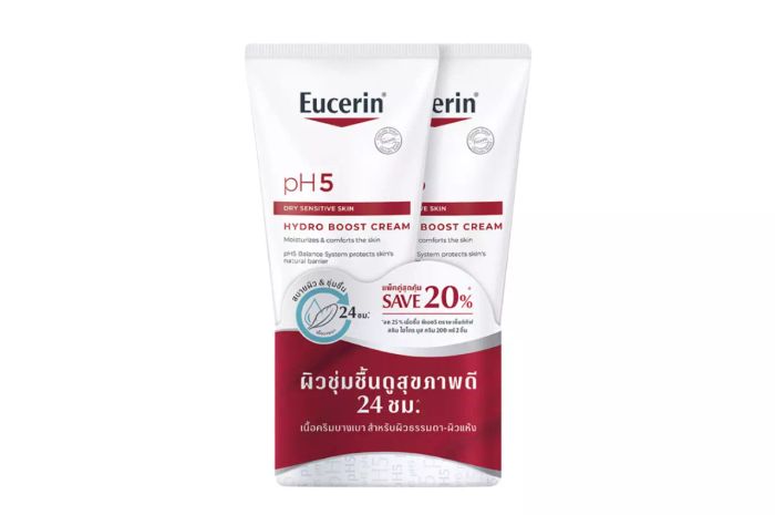 ครีมทาผิว Eucerin สูตร pH5 Dry Sensitive Skin Hydro Boost Cream ครีมบำรุงผิวที่ช่วยปรับสมดุลให้ผิวเนียนนุ่ม ชุ่มชื้น และดูสุขภาพดี อุดมไปด้วย Dexpanthenol และ Seed Oil ที่เติมความชุ่มชื้น พร้อมด้วย pH Balance System ที่ช่วยปรับสมดุลให้ผิวเนียนนุ่ม เนื้อครีมเบา ซึมซาบเร็ว ไม่เหนียวเหนอะหนะ และไม่ทำให้เกิดการอุดตันในรูขุมขน