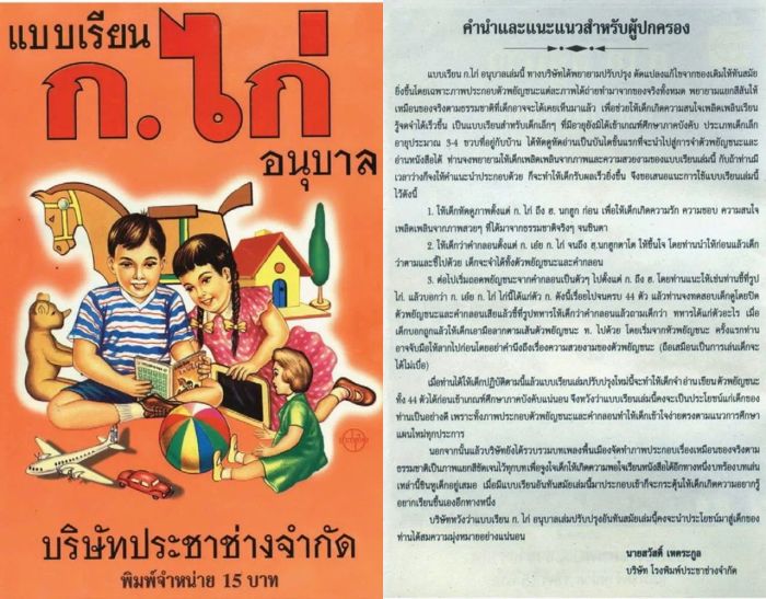 หน้าปกและคำนำหนังสือ "แบบเรียน ก.ไก่ อนุบาล" บริษัทประชาช่าง ฉบับภาพถ่าย พ.ศ. 2539