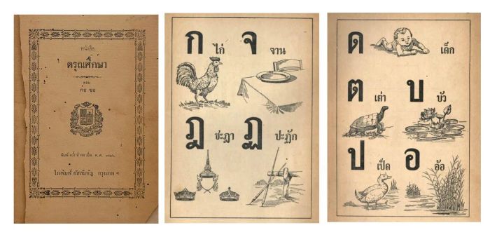 ภาพจากหนังสือ แบบเรียนเร็ว สำหรับเรียนหนังสือไทย เล่ม 1 ที่แต่งโดยสมเด็จฯกรมพระยาดำรงราชานุภาพก ไก่ / ข ไข่ / ฃ ฃวด / ค (ควาย)