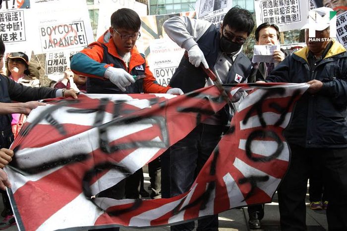 ธงชาติญี่ปุ่นในช่วงสงครามโลกครั้งที่ 2 หรือ Rising Sun Flag กลายเป็นสัญลักษณ์ที่ชาวเกาหลีใต้ไม่อาจหลีกเลี่ยงได้ มันเป็นเครื่องเตือนความทรงจำเกี่ยวกับการกระทำที่โหดร้ายของญี่ปุ่นที่ได้เคยทำต่อเกาหลี