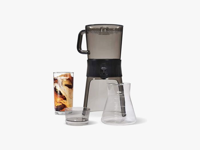 Nếu diện tích bếp hơi khan hiếm, Oxo Compact Cold Brewer là sự lựa chọn tuyệt vời. Đầu tiên, nó rất đáng yêu: Nó đi kèm với một ấm thủy tinh nhỏ xinh với nắp liège dễ thương, và cụm pha chế bao gồm đầu phun mưa mà chúng tôi thích rất nhiều trên máy pha cà phê lạnh Oxo đầy đủ kích thước. Nó nhỏ đủ để để trên mặt bàn, và nó sẽ trông tốt khi đặt ở đó.