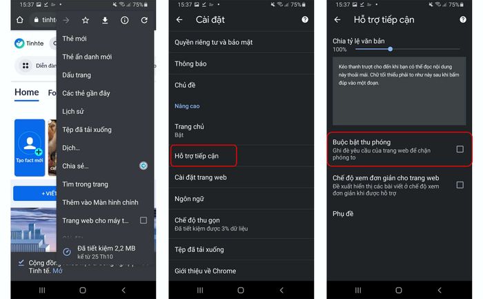 Trong một số trường hợp, các trang web trên thiết bị di động không cho phép phóng to và thu nhỏ theo cách thủ công. Tuy nhiên, trên Chrome bạn có thể làm điều đó. Chỉ cần vào cài đặt Chrome, chọn Hỗ trợ tiếp cận, và bật chế độ Thu phóng. Từ đó, bạn có thể phóng to bất kỳ trang web nào khi xem.Tìm kiếm nhanh với Tìm trong trang