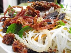 Món nộm bò khô độc đáo với đu đủ xanh, bò khô, rau thơm và nước mắm chua ngọt. Thưởng thức tại các địa điểm như quán nộm Huế Hàm Long, quán Long Vĩ Ôn hồ Hoàn Kiếm để trải nghiệm hương vị đặc sắc với giá từ 20.000VND/suất.