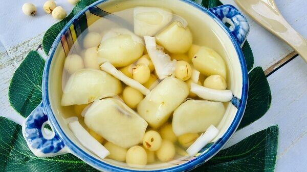 Một món chè ngọt thanh và tinh tế với hương vị của củ năng và hạt sen, mang lại cảm giác dễ chịu và giúp tạo giấc ngủ sâu. Chè được nấu với đường phèn và thêm chút lá dứa để tăng thêm hương thơm. Để thưởng thức hương vị tốt nhất, bạn có thể ăn kèm với đá lạnh. Một lựa chọn tráng miệng dễ chịu và dinh dưỡng.