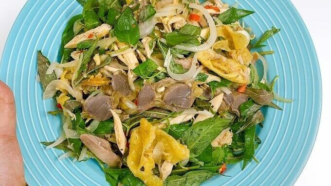 Trong danh sách món ăn mùa hè khi đi camping, không thể không kể đến gỏi gà trộn rau răm. Vị chua ngọt của thịt gà và nước sốt, cùng hương thơm đặc trưng của rau răm, tạo nên một bữa ăn ngon, dai, thấm đẫy hương vị. Bạn cũng có thể thêm phần mề gà để tăng thêm hương vị và sự lạ miệng. Nhớ nhặt rau răm nguyên lá, bỏ cành để thơm ngon nhất.