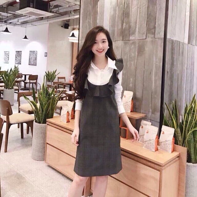 Váy yếm ca rô dáng suông phối bèo trẻ trung và năng động.