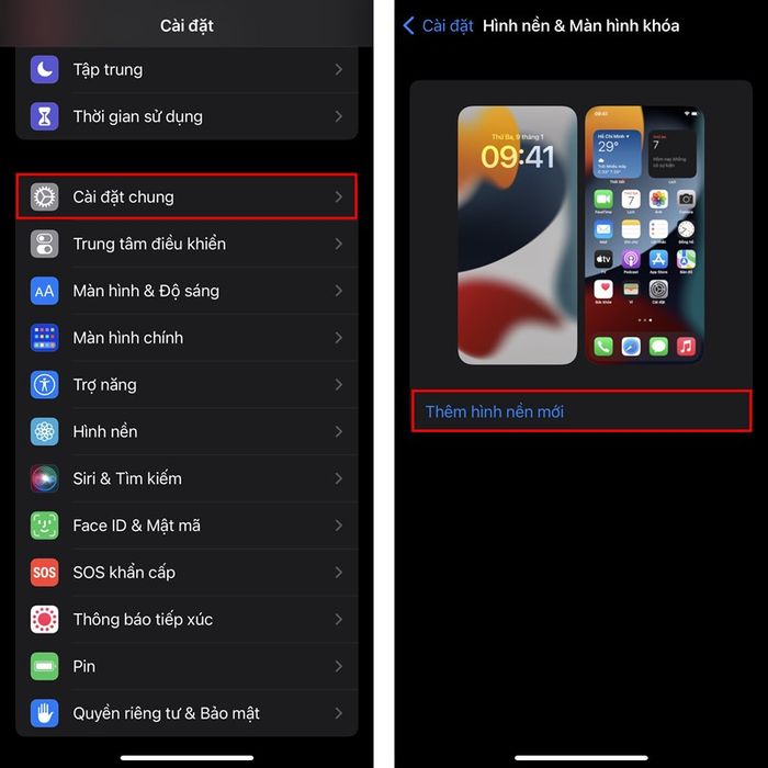 1. Bước khởi đầu. Vào Cài đặt > Cài đặt chung > Thêm hình nền mới.