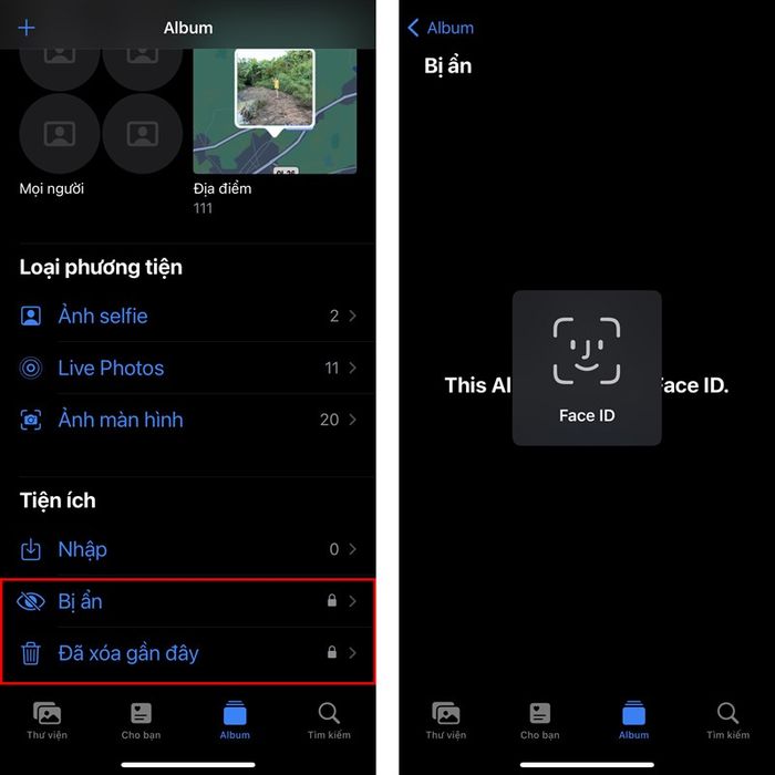 Bước 2. Bây giờ, để mở Album Bị ẩn và Đã xóa gần đây, bạn cần kích hoạt Face ID, Touch ID, hoặc nhập mật khẩu mới nhé.