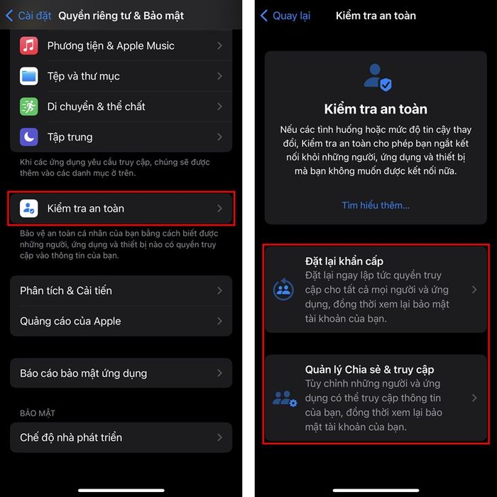 iOS 16 mang đến tính năng Kiểm tra an toàn mới, giúp bạn nhanh chóng tắt chia sẻ với người khác, đặc biệt là trong tình huống có mối quan hệ lạm dụng. Truy cập Cài đặt > Quyền riêng tư & Bảo mật > Kiểm tra an toàn để cài đặt.