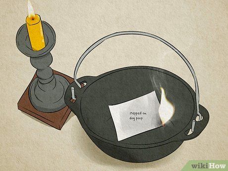 dọn dẹp nhà cửa để loại bỏ bất kỳ năng lượng tiêu cực nào. Trên một tờ giấy trắng hoặc da dê, viết xuống tất cả những điều không may mắn đã xảy ra gần đây. Thắp một cây nến mảnh dài (nên là màu xanh lá cây cho may mắn tốt). Sử dụng cây nến để đốt một góc của tờ giấy, và nhanh chóng thả nó vào một tô lớn chịu nhiệt. Trong khi tờ giấy đang cháy, lặp lại: