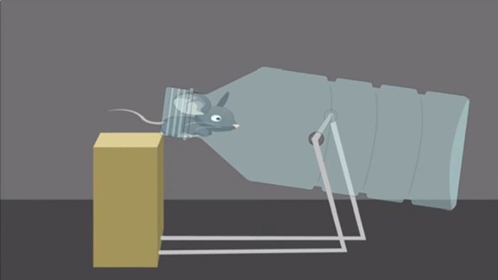 Khi chuột leo lên chai nước được phết bơ, cơ chế xoay vòng của chai nước sẽ làm chúng trượt xuống xô và bị mắc kẹt ở đó.