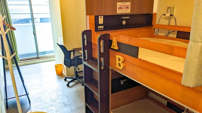 A standout feature of the hotel is the two-story Fluffy Maisonette room. The upper floor includes a living area and a mini kitchen, while the lower floor features a bedroom with four low beds arranged side by side, making it ideal for large groups.