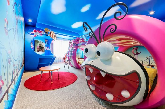 Additionally, the hotel allows guests to personalize their rooms with optional themes like a starry sky or rainbow, creating a unique and fun resting space.